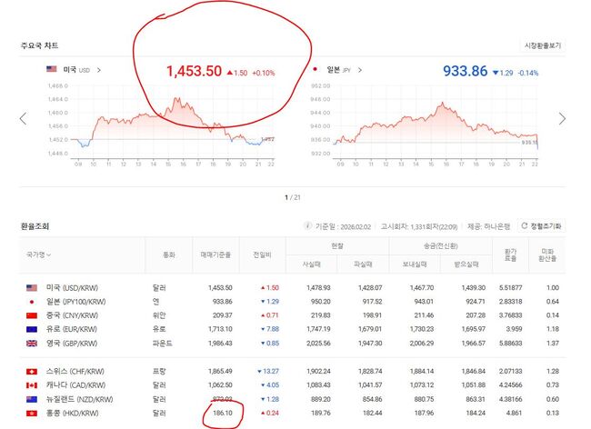 2월 2일 원화/미달러 기준환율 1,453.50, 원화/홍콩달러 기준환율 186.1
