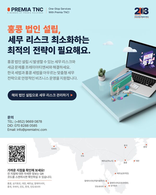■ 프레미아티엔씨(구코차이나티엔씨) : 법인설립/관리, 회계결산, 세무자문및회계감사+852 9669 0878 info@premiatnc.com / 웹사이트 https://premiatnc.com/kr//