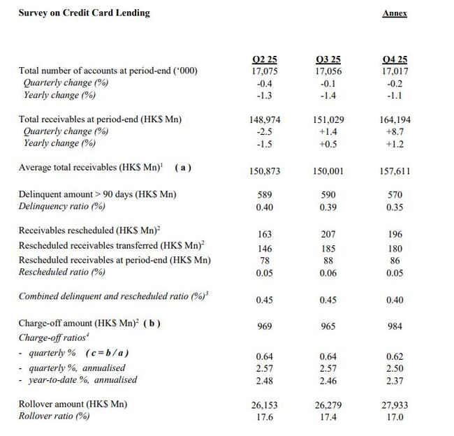 2월 16일 홍콩통화청은 2025년 4분기 신용카드 대출 조사 결과를 발표했다.