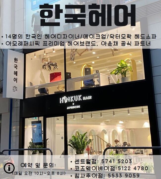 ▲ 한국헤어: 아모레퍼시픽프리미엄헤어케어브랜드, 아윤채공식파트너로서프리미엄약제만 을취급합니다. 센트럴/코베/침추3개지점운영, 커트(290불부터), 펌, 트리트먼트, 닥터모락두피탈모관리, 반영구, SMP 두피문신