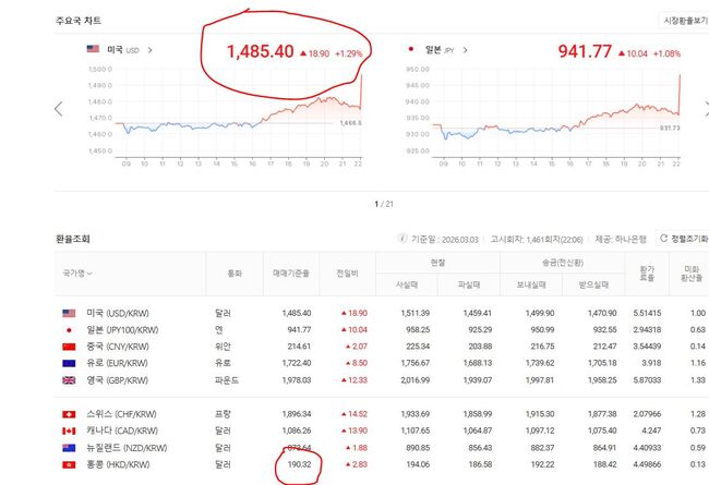 3월 3일 원/미달러 기준환율 1,485.40 , 원/홍콩달러 기준환율 190.32