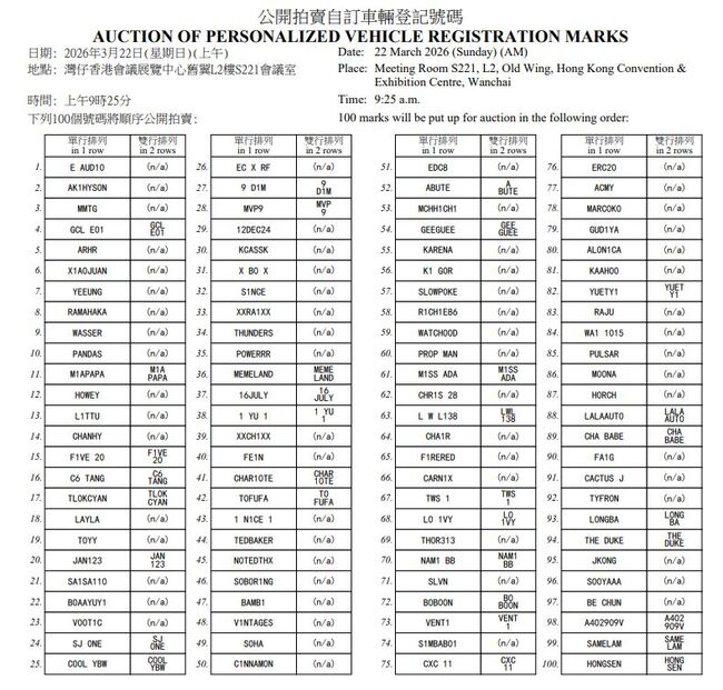 홍콩 교통국은 개인 맞춤형 차량 번호판(PVRM) 경매를 3월 22일(일) 홍콩 컨벤션 전시센터(완차이) 구관 2층 S221 회의실에서 개최한다고 발표했다.