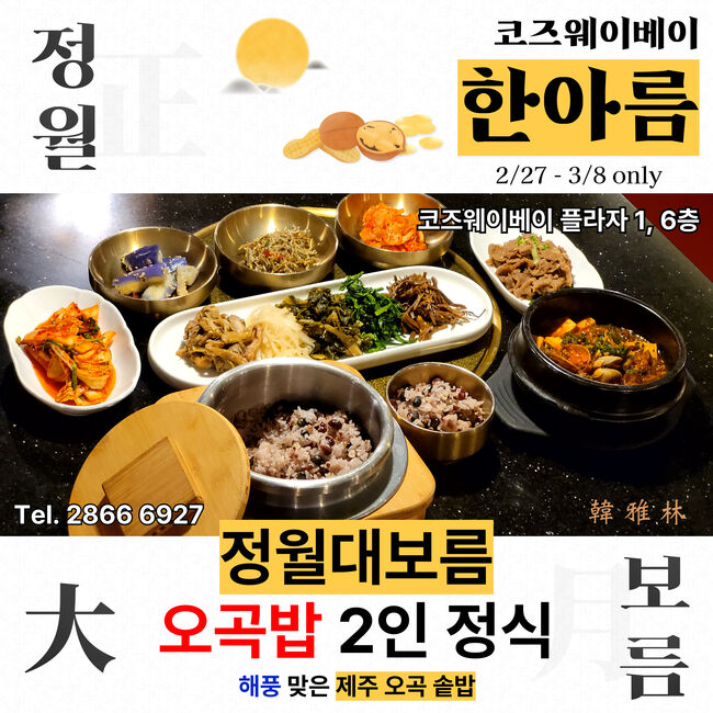 ■ 한아름 (코즈웨이베이) 정월 대보름 오곡밥 2월 27일부터 해풍맞은 제주 오곡 솥밥 2인 정식(고사리나물, 시금치, 시래기, 무나물, 호박나물)