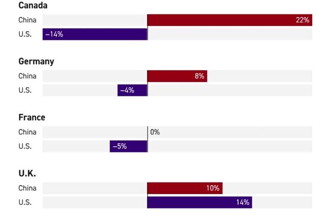 이는 중국의 새로운 안정 때문이 아니라 트럼프의 정책으로 인한 혼란 때문인 것으로 보인다. 캐나다와 독일 응답자 대다수는 중국과의 관계 강화 시도가 미국에 대한 의존도가 높아졌기 때문이라고 응답했다.