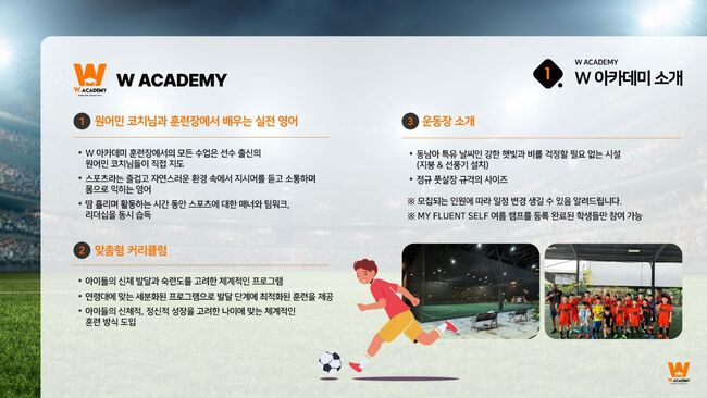 - W Academy 축구캠프 등록 가능 (타 영어캠프 등록자 참여 불가)